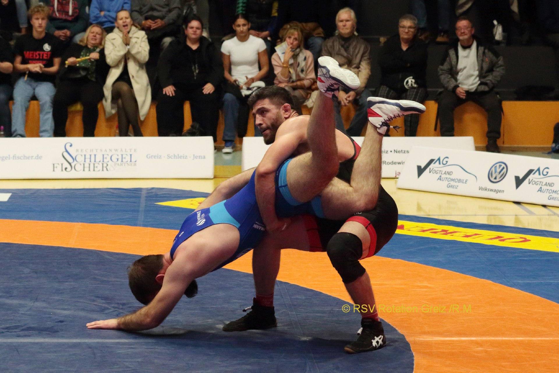 Sebastian Wendel (98 kg/f) traf auf den ukrainischen Kriegsflüchtling Oleksandr Korchmariuk., der seit zwei Jahren in Witten lebt. Der erste resolute Angriff des Greizers hätte beinahe den Ausgleich für den schnellen Rückstand bedeutet. Dagegen geriet Sebastian Wendel kurz vor der Pause 0:4 in Rückstand. In der zweiten Hälfte rang eigentlich nur noch der Greizer, der zum 2:4 Anschluss kam. Weitere Wertungen für Sebastian Wendel sollten aber nicht fallen, obwohl er sich noch zwei große Möglichkeiten dafür erarbeitete. Noch Sekunden vor Schluss hing der Sieg des Ukrainers am seidenen Faden. (4:7)